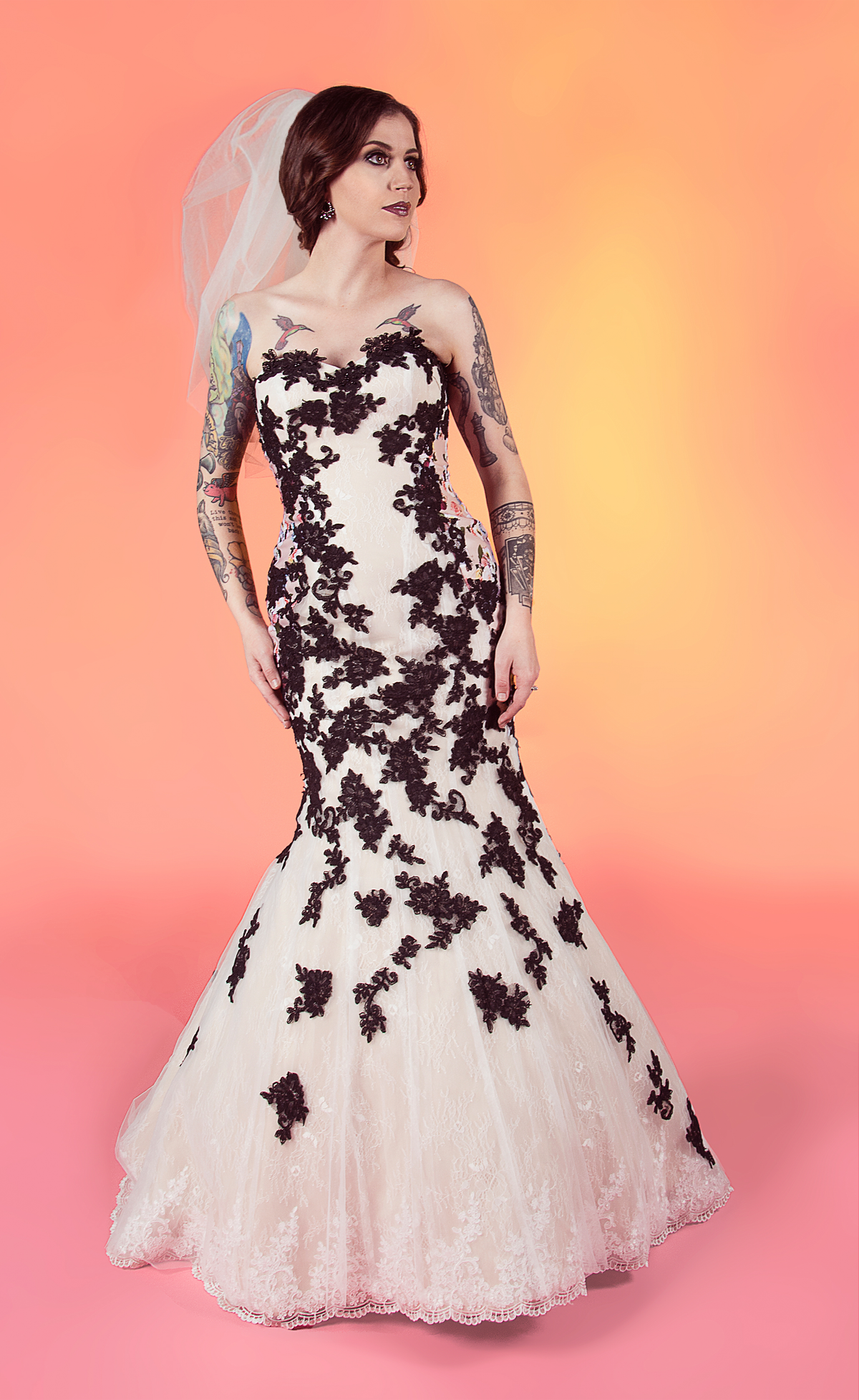 We're so excited to offer EVERY gown in our collections in any color, at no additional cost.  That certainly includes black!  We're always happy to accommodate your request, so if you want a champagne gown with black lace, we'll make it HAPPEN!  Styles in the Renegade collections generally range $1200-2800. See those below!