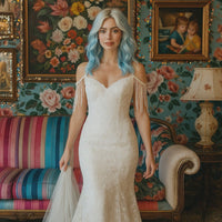 "Dakota Venus" is takes our classic "Dakota" and infuses a little Texas charm with soft off-shoulder fringe sleeves. The subversive stunner, though, is our original Venus Flytrap lace, appliqued alongside this lovely garden lace. Soft sweetheart neckline, and figure-hugging mermaid silhouette. Deep back and detailed train make a style perfect for garden, beach, or chapel.