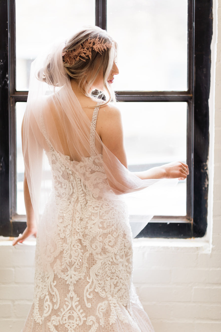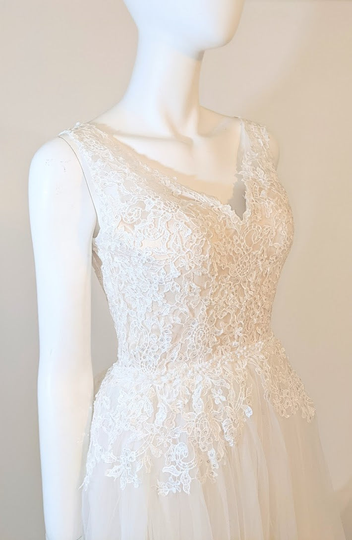 Romantic simplicity in delicate garden lace sprinkled with subtle sequin. Soft sweetheart and dramatic plunge back.