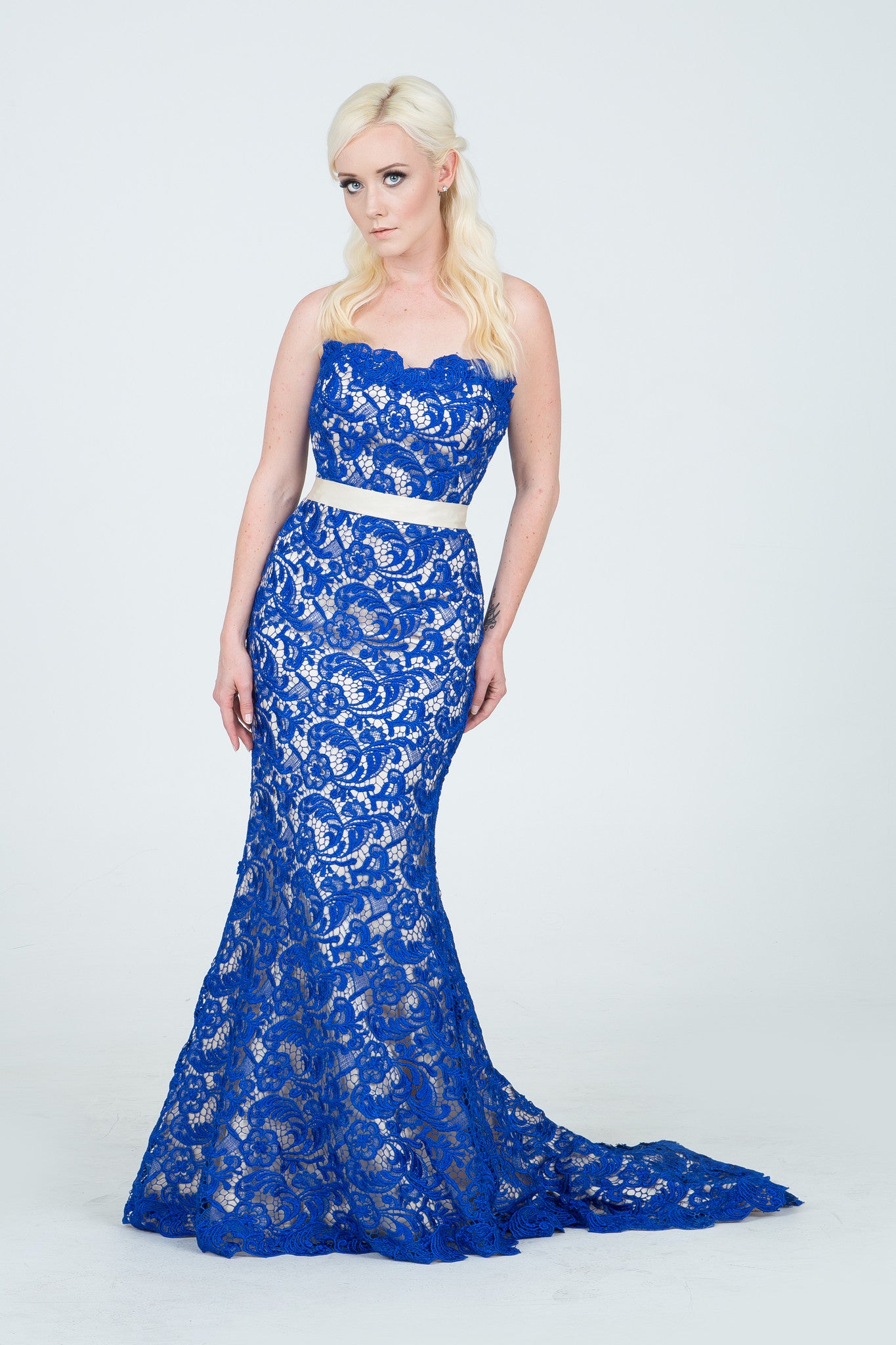 Venetian lace mermaid with chapel train and grosgrain sash. Lined in champagne haute satin (contact us with special requests).